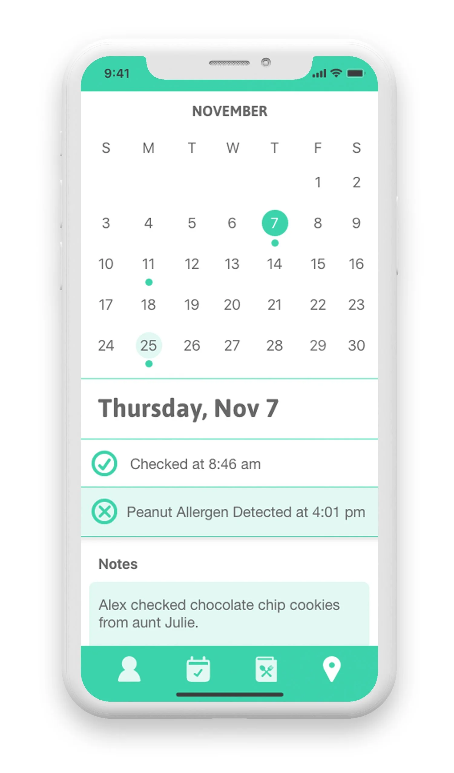 Receive notifications when the device is activated and detects an allergen. On the calendar, you can see what day the device was used and the details of the scans in the notes section.