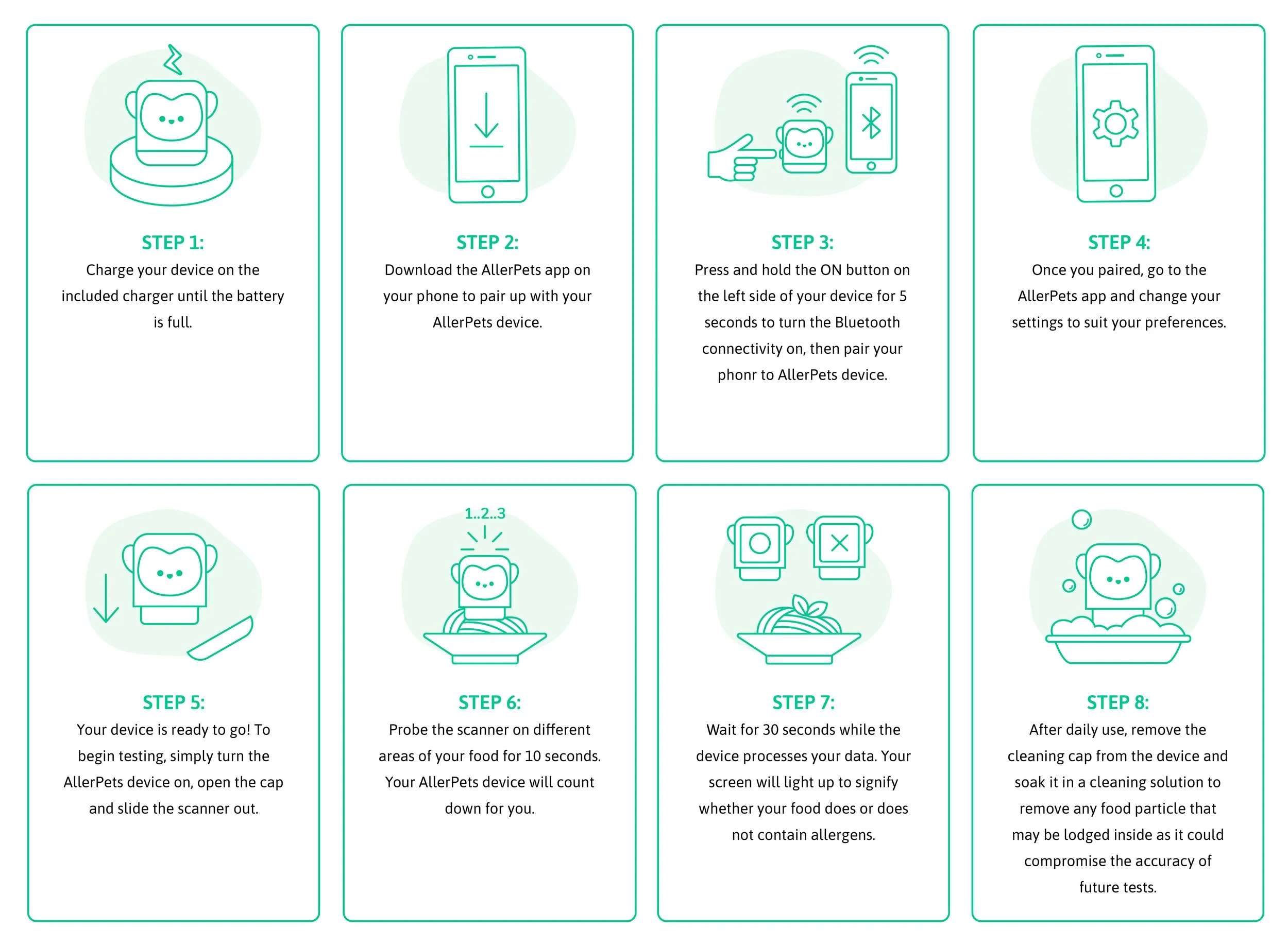 After personalizing and purchasing the AllerPets device online, users can set up their device by connecting to the companion app prior to using it. The visual representation outlines the step-by-step directions on how to use and maintain the AllerPets device.