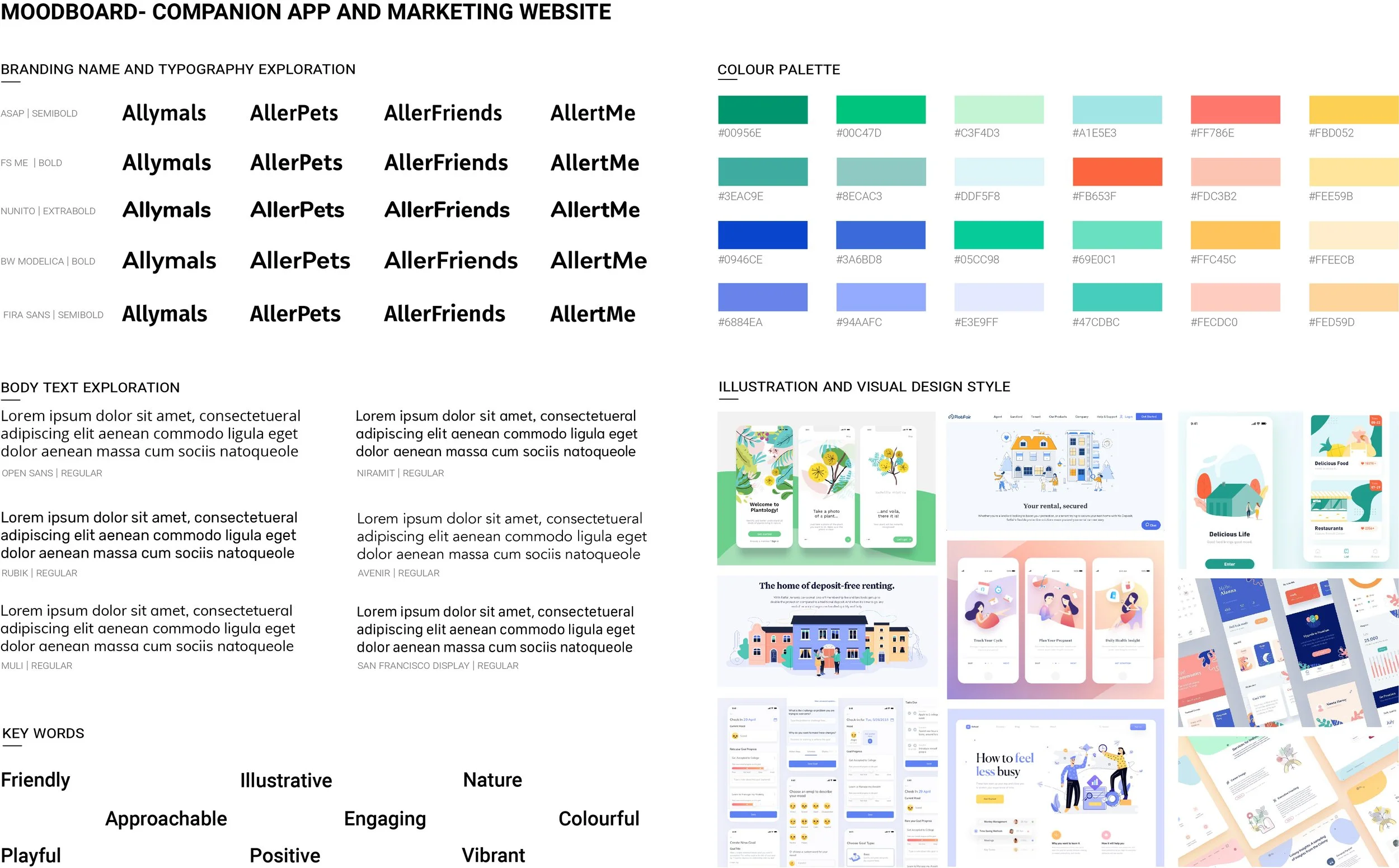 We created a mood board to help us explore the different style approaches in terms of colour palette, typography, illustrations, brand values, and also research into other design work that would feed us some inspirations.