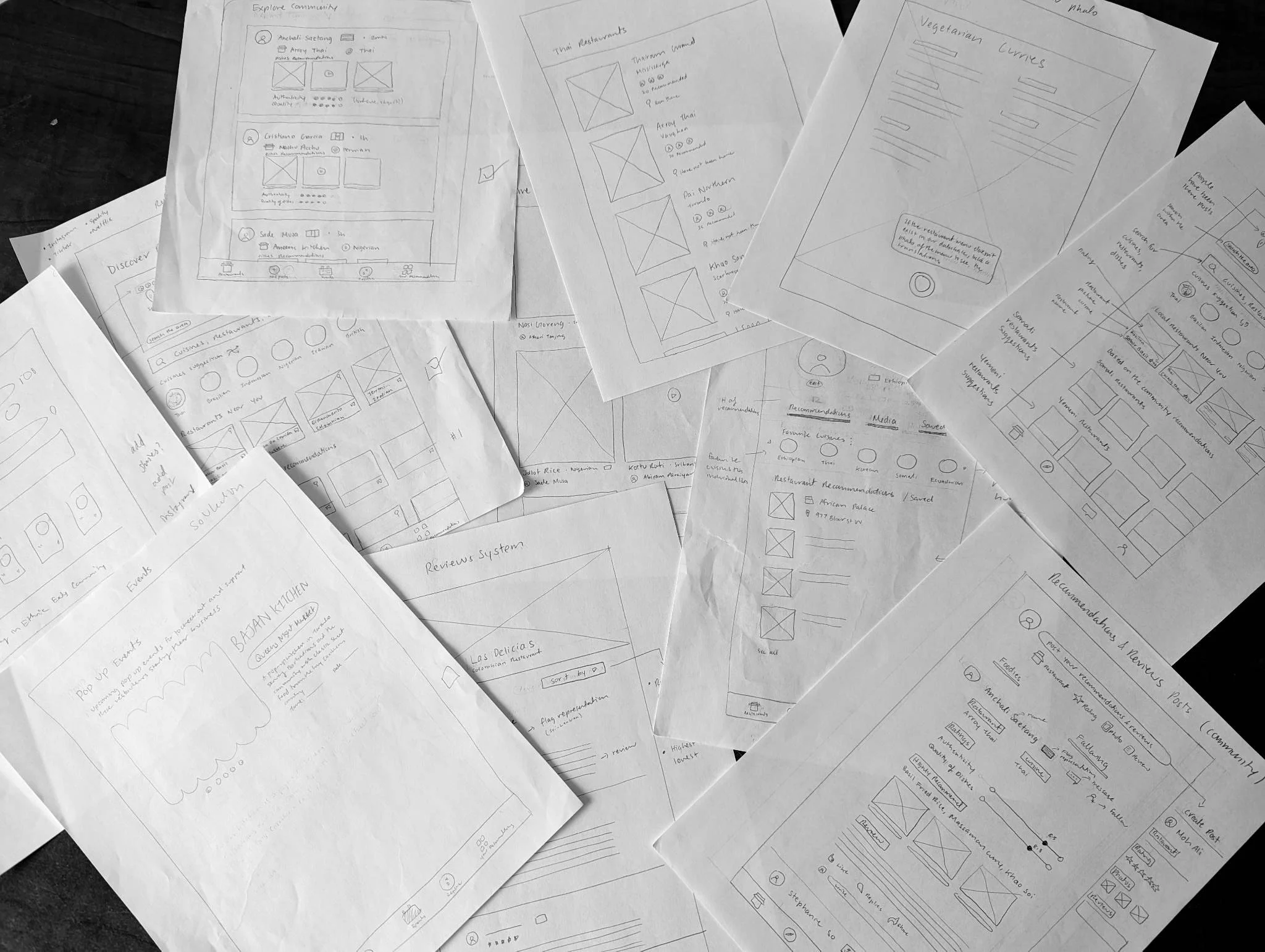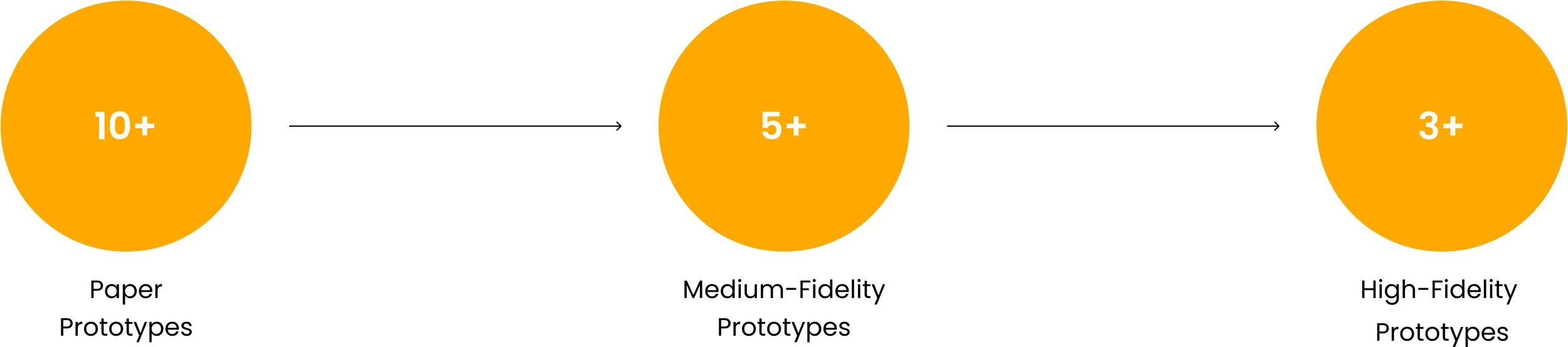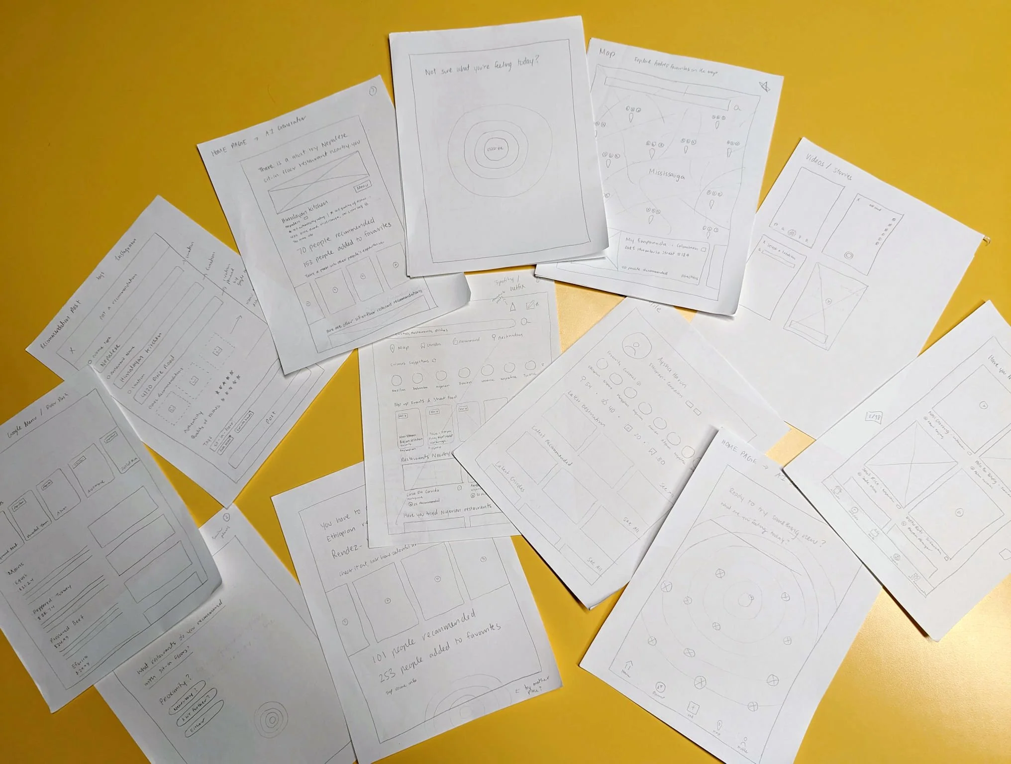 To start the development process, I created paper prototypes to brainstorm ideas and design user flows. This allowed me to test out initial concepts and determine how the prototype's features and functionalities should be structured and operated. I iterated through several rounds and versions, gradually improving the prototypes from low to medium to high fidelity. During this process, I made various changes, from completely overhauling the design concept to modifying and optimizing user flows. Additionally, I added, expanded, and enhanced features and functions through multiple user testing rounds by collecting insights, feedback, and suggestions from the participants.