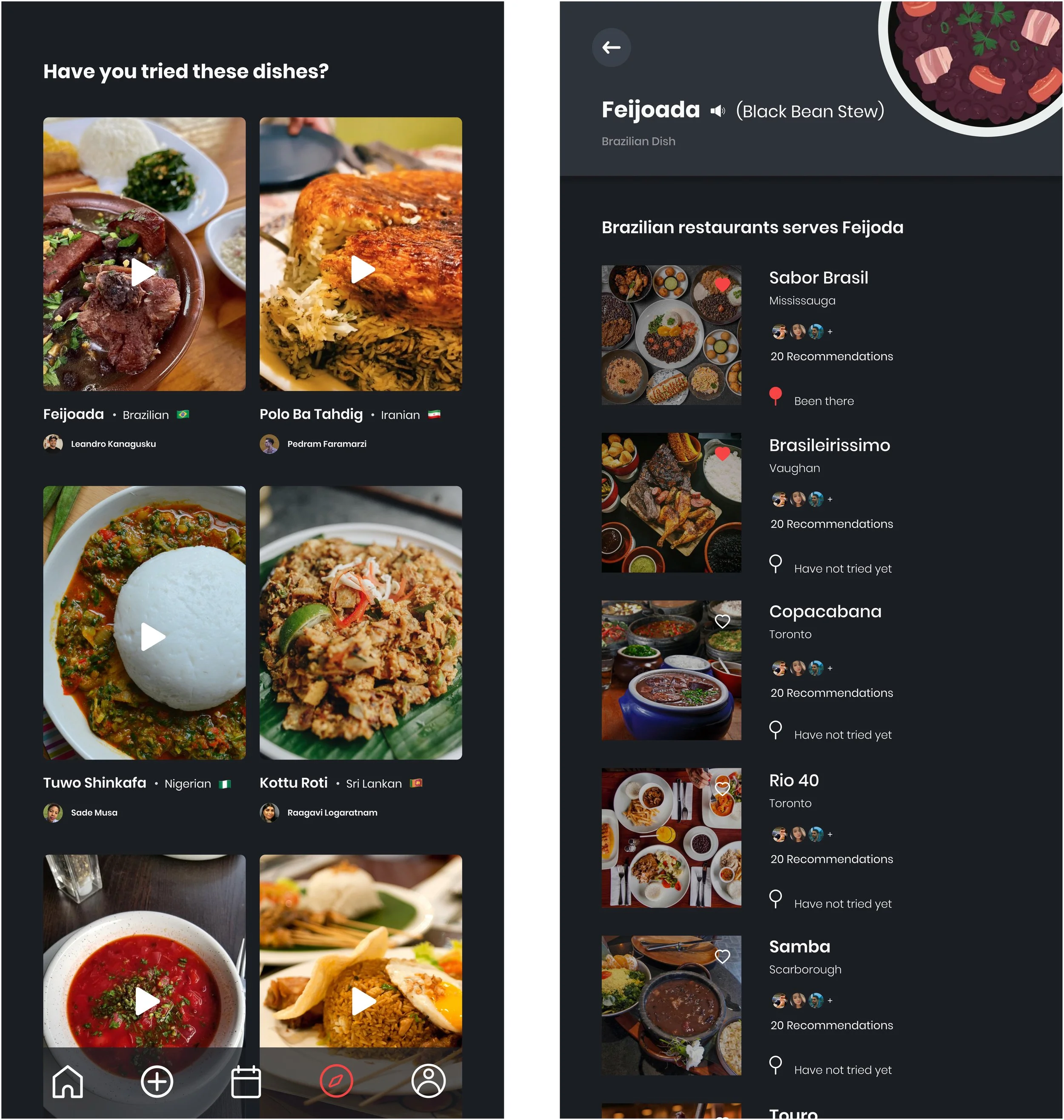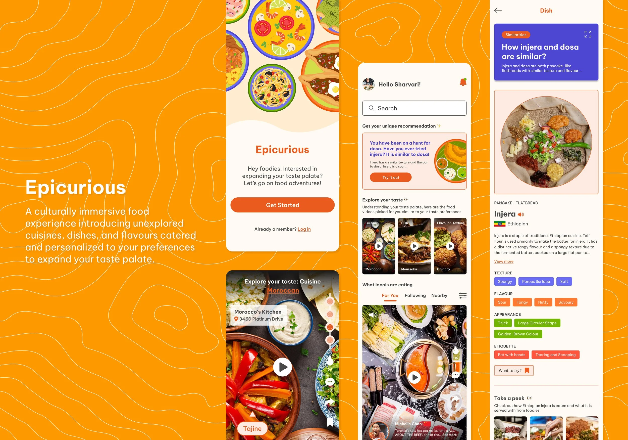 Example #1 Flow: When Epicurious detects that a user frequently consumes Dosa dishes based on their video posts, or if Epicurious is picking up their activities and engagement on the app, Epicurious will recognize and analyze their preference and suggest a similar dish that the user has not tried yet. In this case, Epicurious recommends Injera, as it has a similar taste and flavour profile to Dosa. Since this may be an unfamiliar dish for the user, Epicurious will provide a detailed description of Injera, including its texture, flavour, appearance, and etiquette. Crucially, Epicurious will pair restaurant recommendations that serve Injera to check out, accompanied by videos of other individuals eating the Injera dish. As both Dosa and Injera are pancake-like dishes, Epicurious provides recommendations for other similar dishes to explore and look into.