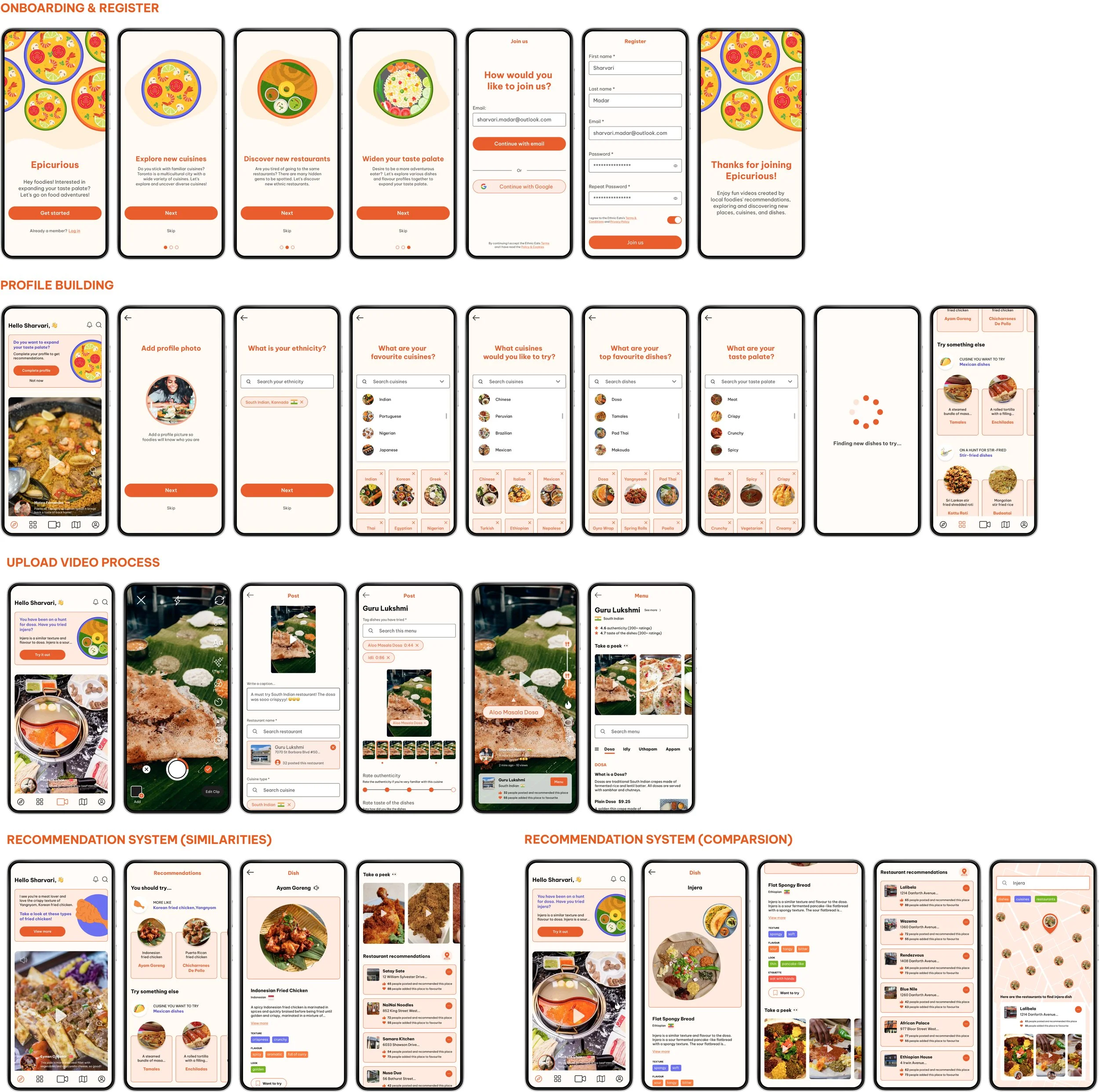 Epicurious is a user-generated platform that allows users to upload fun videos of their food adventures at ethnic restaurants while capturing mouth-watering dishes. Individuals are the most reliable source of recommendations as they know the must-try restaurants according to their ethnicity and knowledge of their cultural food, especially posting hidden gems of authentic restaurants that are unknown to many people. Since individuals are unknown and unaware of what dishes exist, they could miss out according to their tastes. This is where Epicurious's algorithm analyzes and determines their taste preferences based on their profile and activities on the application to generate targeted dish recommendations. Therefore, according to their taste palate, Epicurious identifies connections and comparisons to predict and tailor what users may want to try dishes in the future, generating personalized suggestion prompts, recommendation curations, and specially-tailored video clips, including pairing restaurant recommendations. As a result, individuals are broadening their taste palate through Epicurious, acknowledging what they will like, allowing users to discover and expose new dishes, cuisines, and restaurants that they haven't tried before, adding to their favourites and enriching their food adventures. In addition, Epicurious will generate restaurants that match your taste and your friends' preferences, taking the effort out of searching for a place to eat.
