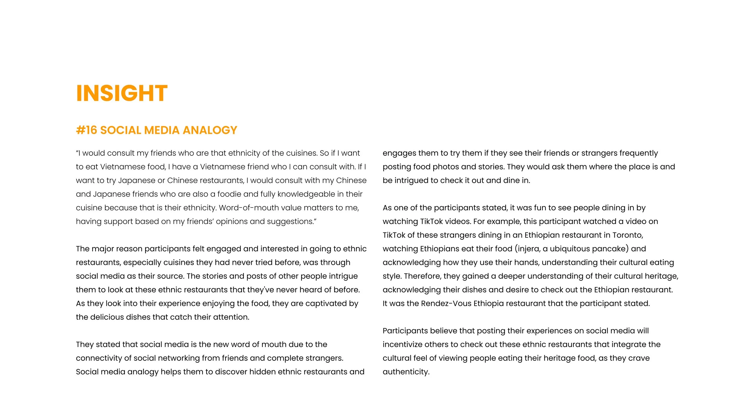 The co-creation activity helped me to understand and uncover how users engage themselves to venture into ethnic restaurants. Participants stated when it comes to restaurants of their ethnicity, it is easy for them to enter the restaurant and check it out since it is their cultural nostalgic cuisine, as they eat their cultural dishes every day and grew up with these kinds of food. Resulting, they are always on a hunt for trying new restaurants in their ethnicity. However, this activity is to investigate when it comes to other ethnicities: what is the drive or motivation to go to these ethnic restaurants? What gives them the push? Trying new cuisines or cuisines that are unknown to individuals can be intimidating or hesitant to try. I intend to investigate how to implement this sense of engagement agitator for users to try these ethnic restaurants they could be missing out on.