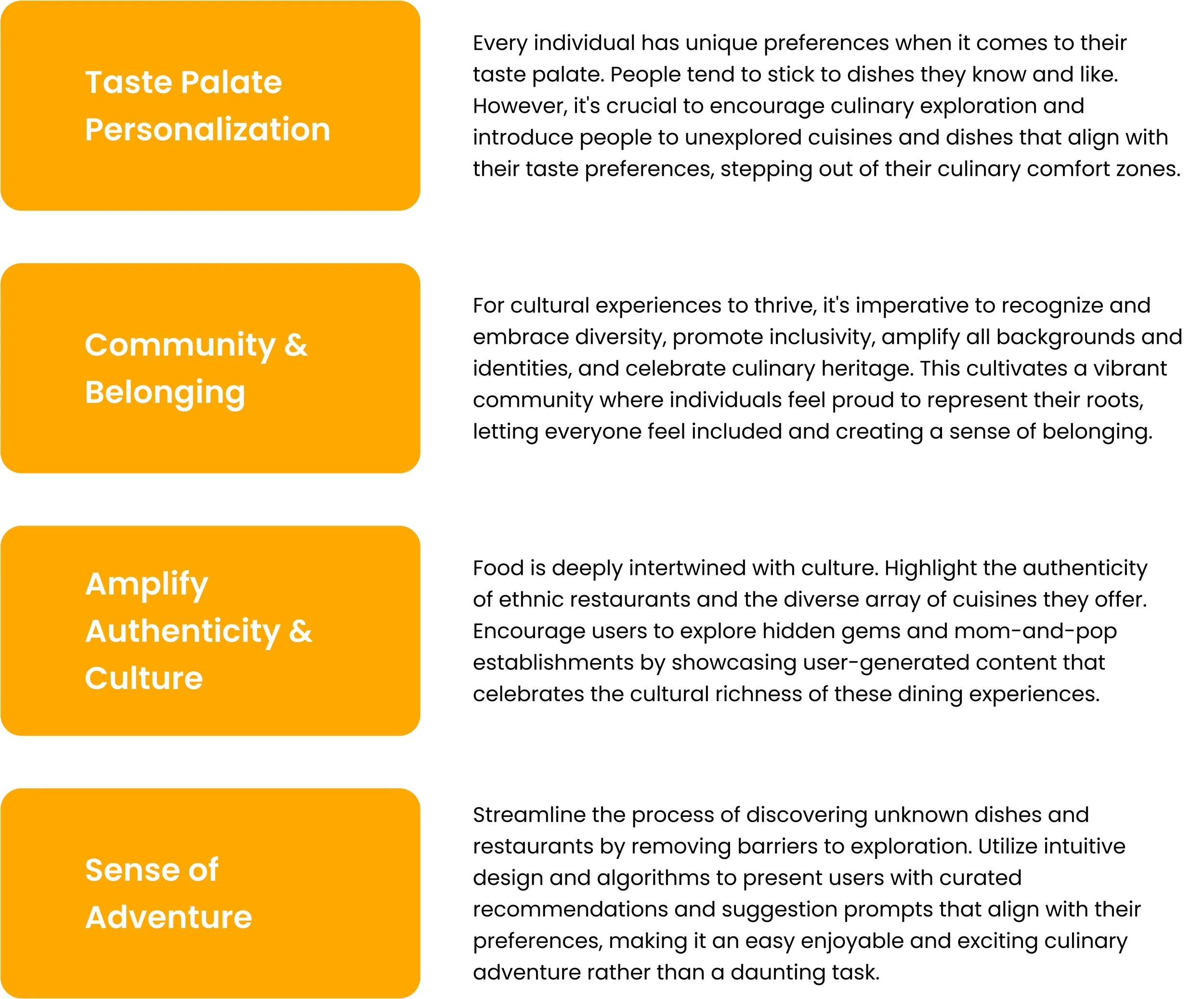 The benefit sought is to enhance individuals' culinary experiences by expanding their taste palates, catering to their preferences, and enriching their sense of food adventure. This is cultivated through the Epicurious platform, which is dishes driven and offers generating personalized dish recommendations paired with restaurant recommendations based on users' taste preferences, facilitates exploration of diverse cuisines and cultural dishes that have not been explored yet, and provides a user-generated platform for sharing food adventures and discovering hidden gem restaurants. Ultimately, the goal is to provoke an exciting experience by bringing an engaging and compelling approach to incentivize users to explore new and unfamiliar cuisines, broaden their culinary horizons, and enjoy a more diverse range of dining experiences, including having a sense of belonging that their native cuisine is available.
