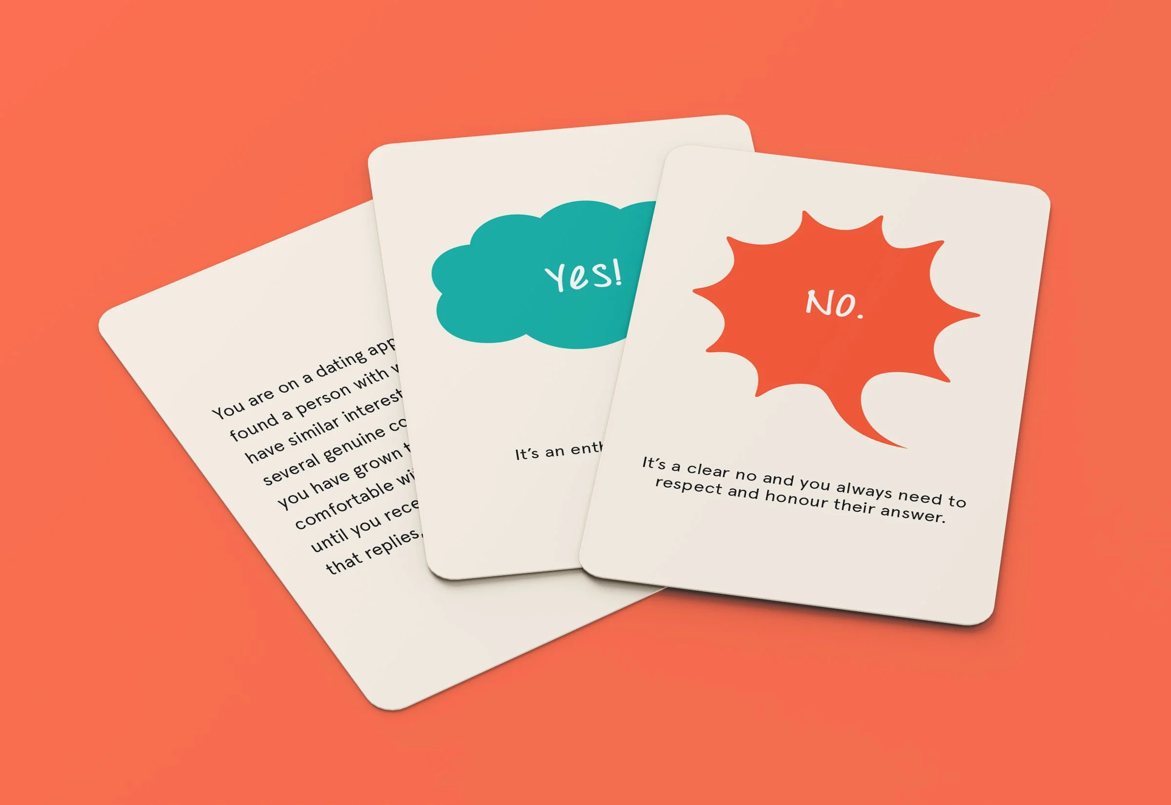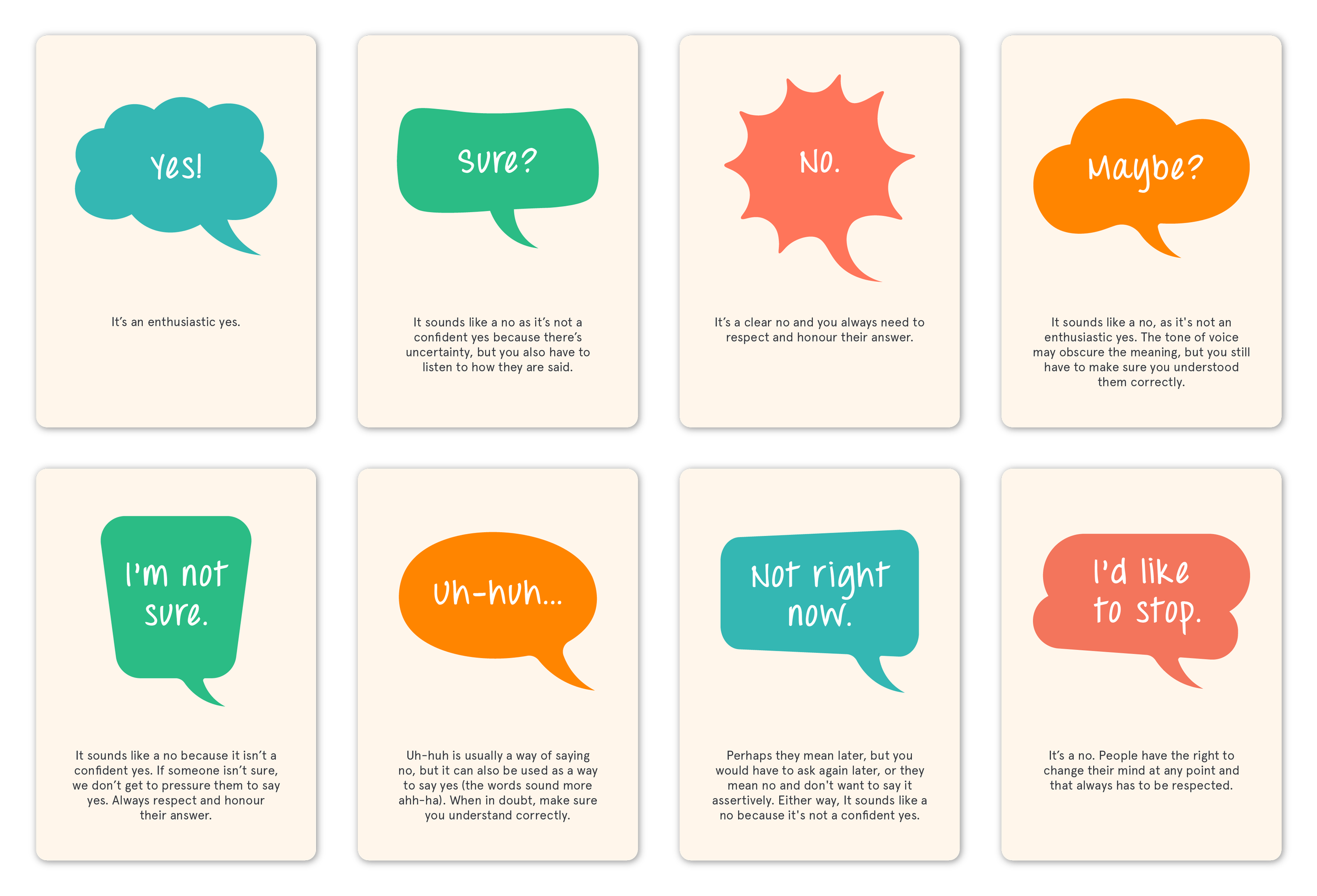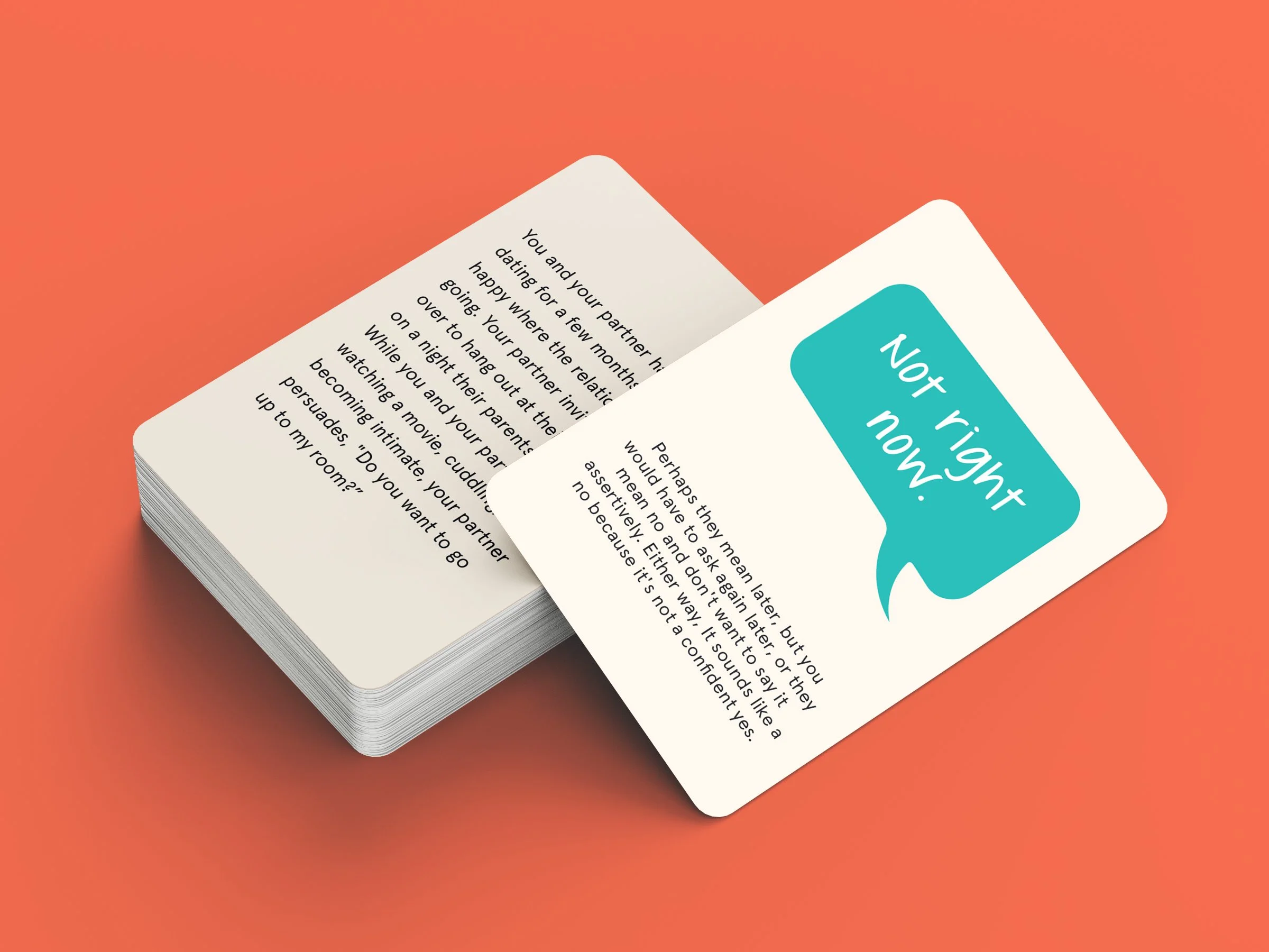 The Practice Consent aims to teach preteens about consent and how to practice and be prepared in everyday life, particularly in emotional and sexual situations. The game provides a deck of scenario cards, and each player receives a set of response cards as well. One player in the group can draw a scenario card from the deck and read the scenario aloud. Everyone then chooses a response card to the given scenario. Each response card accompanies a meaning behind the response. Since the scenario cards are open to interpretation, each player can discuss their selected response card in an attempt to start a conversation.