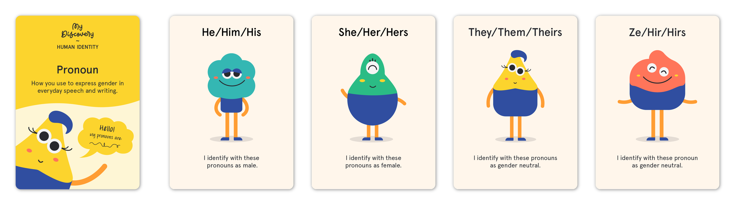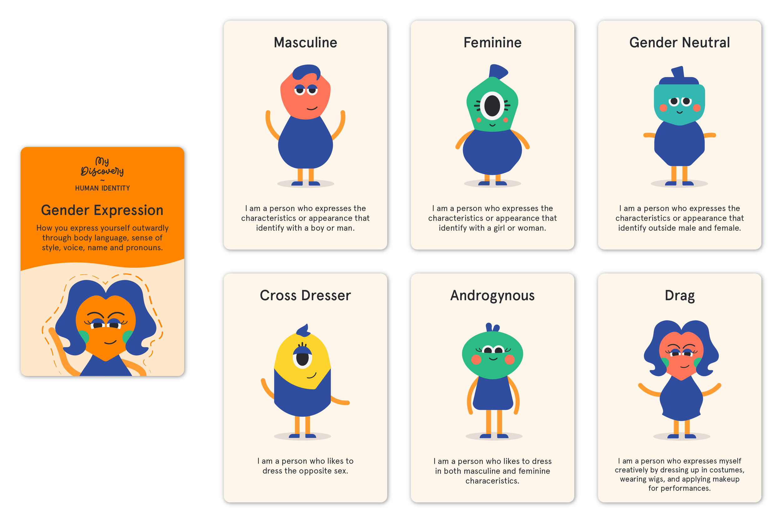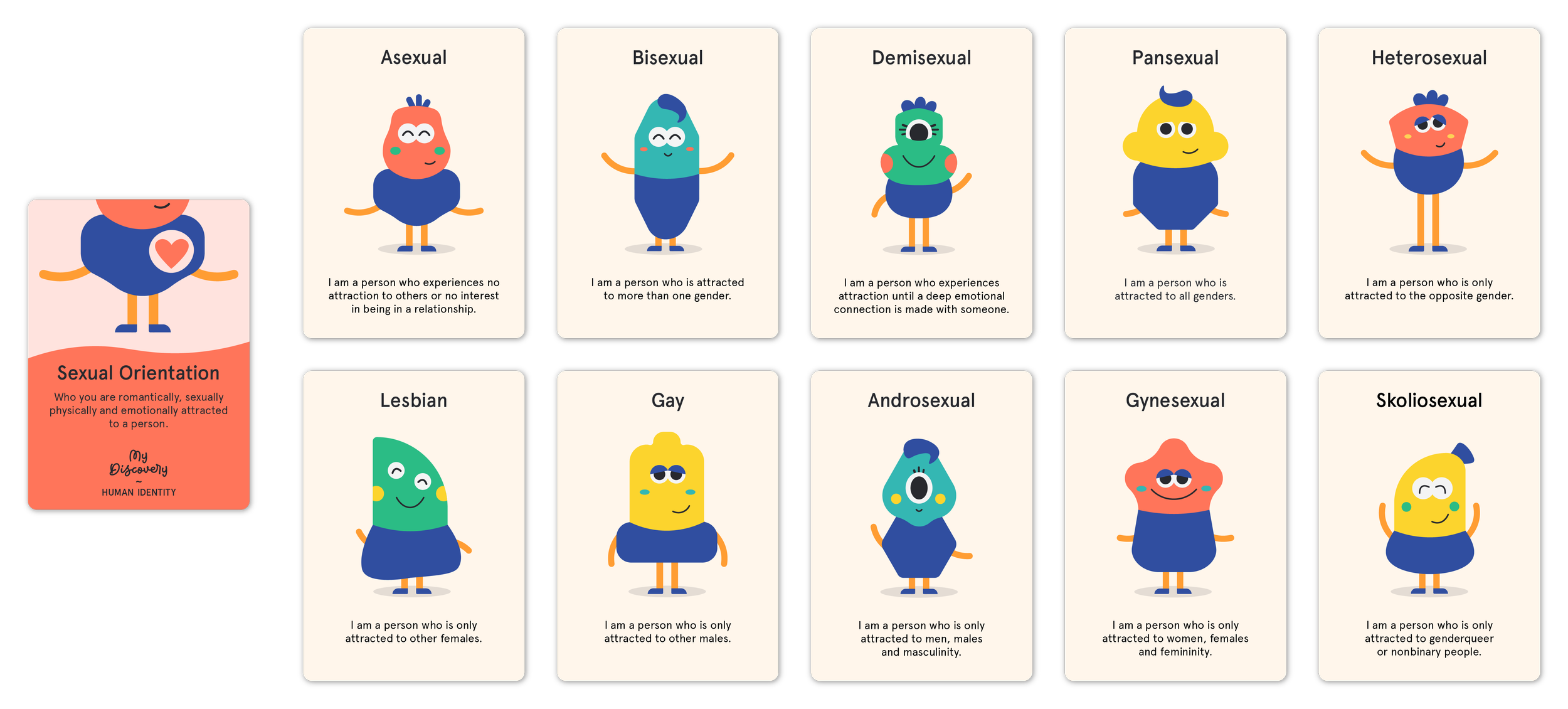 In my initial research of visual style for the Human Identity card game, I thought of creating LGBTQIA+ symbols or human figures representing each identity, sexuality, and expression. However, I thought symbols would be too complicated to understand, and I was thinking about how I might illustrate a person, for example, as an agender in a human figure? There is no specific image of an agender. Therefore, I created unique and playful characters as this may help children and preteens understand that they cannot judge someone's identity, sexuality, and expression solely based on their appearance. These characters became the signature design as I wanted to maintain consistency with the other card games.